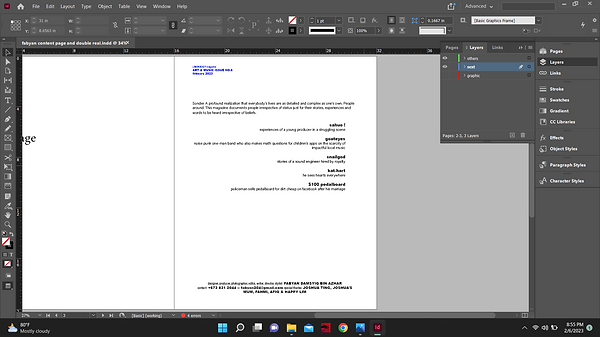 In indesign, I first added the 'contents' header on top and changed its font to acumin variable concept extra condensed light. Then, I added placeholder text in the place of the articles to plan how I should format this page. The picture above shows how the text looks like with the actual articles. The dummy articles are accompanied with short descriptions to make the page more filled. The descriptions are from real stories told by people that I've met condensed into funny sounding sentences. As of now, I am going back and forth working on 2 laptops because indesign stopped working on my laptop and I have to work on a schedule because the owners of the laptops want to use it as well so there is another obstacle to face.
